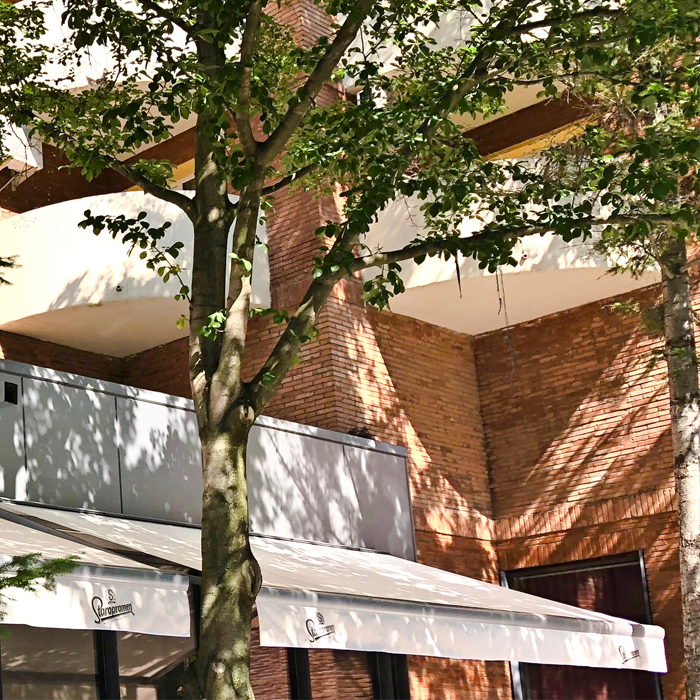 Marchiză cu un design elegant, perfectă pentru terase. Marchiza are structură metalică, prelată din acril sau airtex și acționare manuală cu manivelă.
